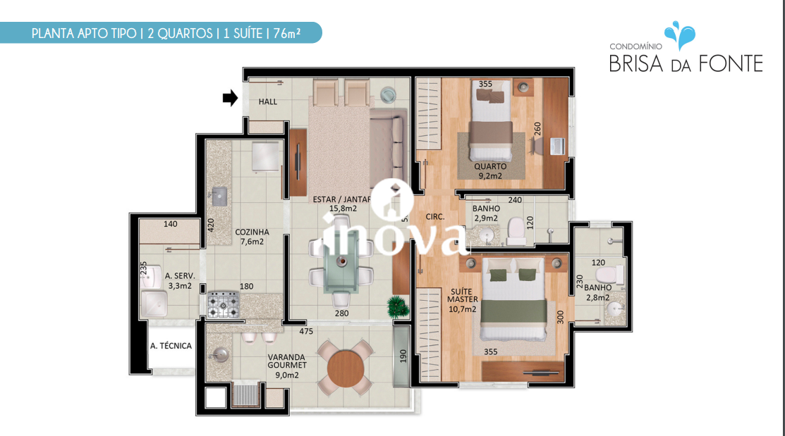 Brisa da Fonte contém duas metragens sendo 76 m2 ou 116 m2 (cobertura 2 suítes).