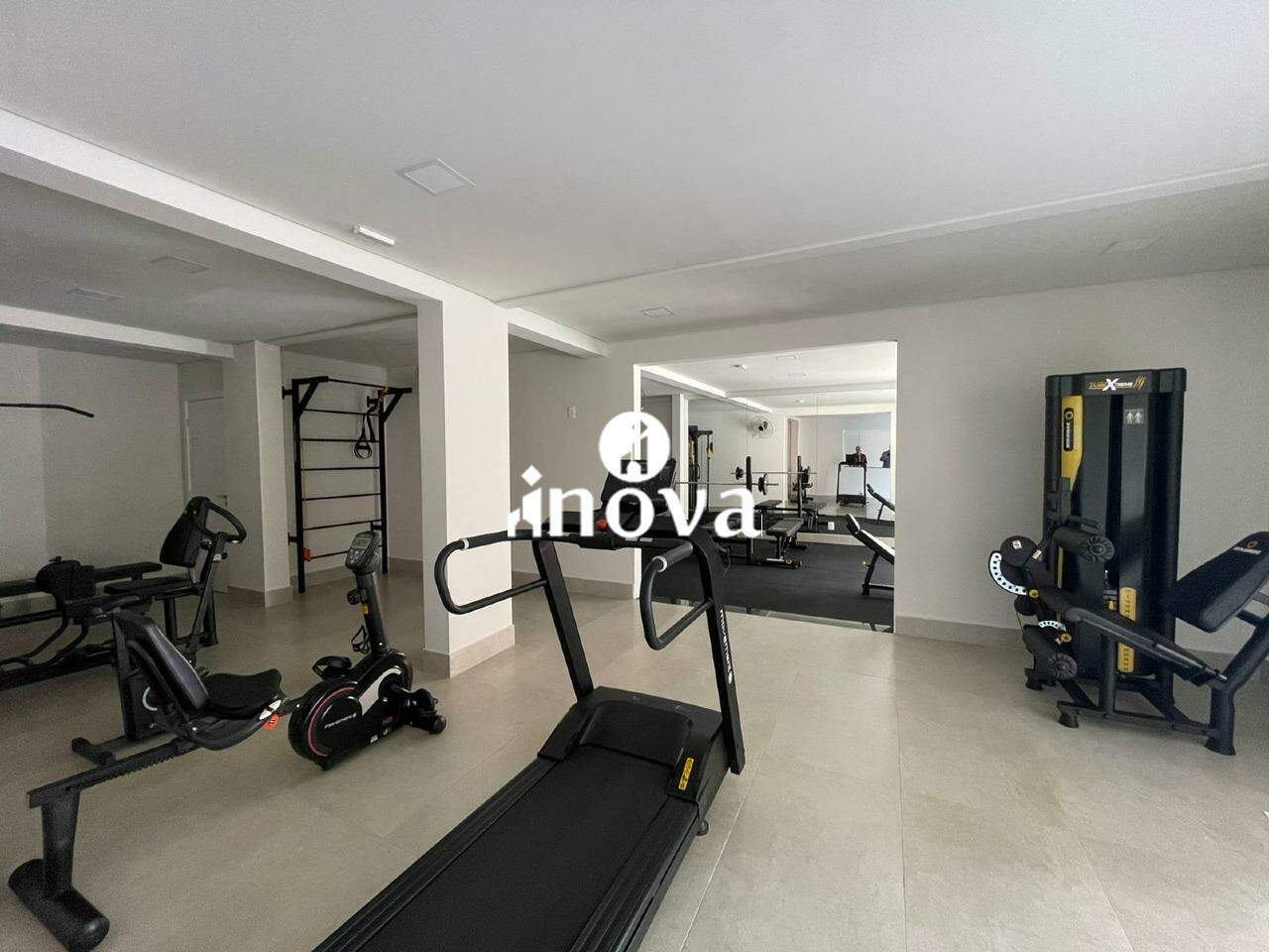Área comum e lazer toda com móveis e academia com equipamentos.